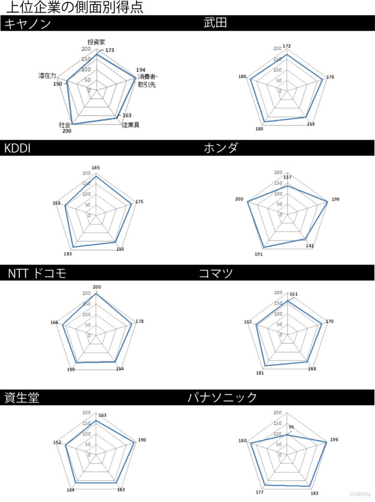 These five aspects of the NICES are related to CSR. The purpose can be considered as an estimation of the CSR effort toward a sustainable society. In addition, it is necessary to make efforts to obtain high scores in all aspects. It is inferred to show radar charts of the top eight to confirm the above.