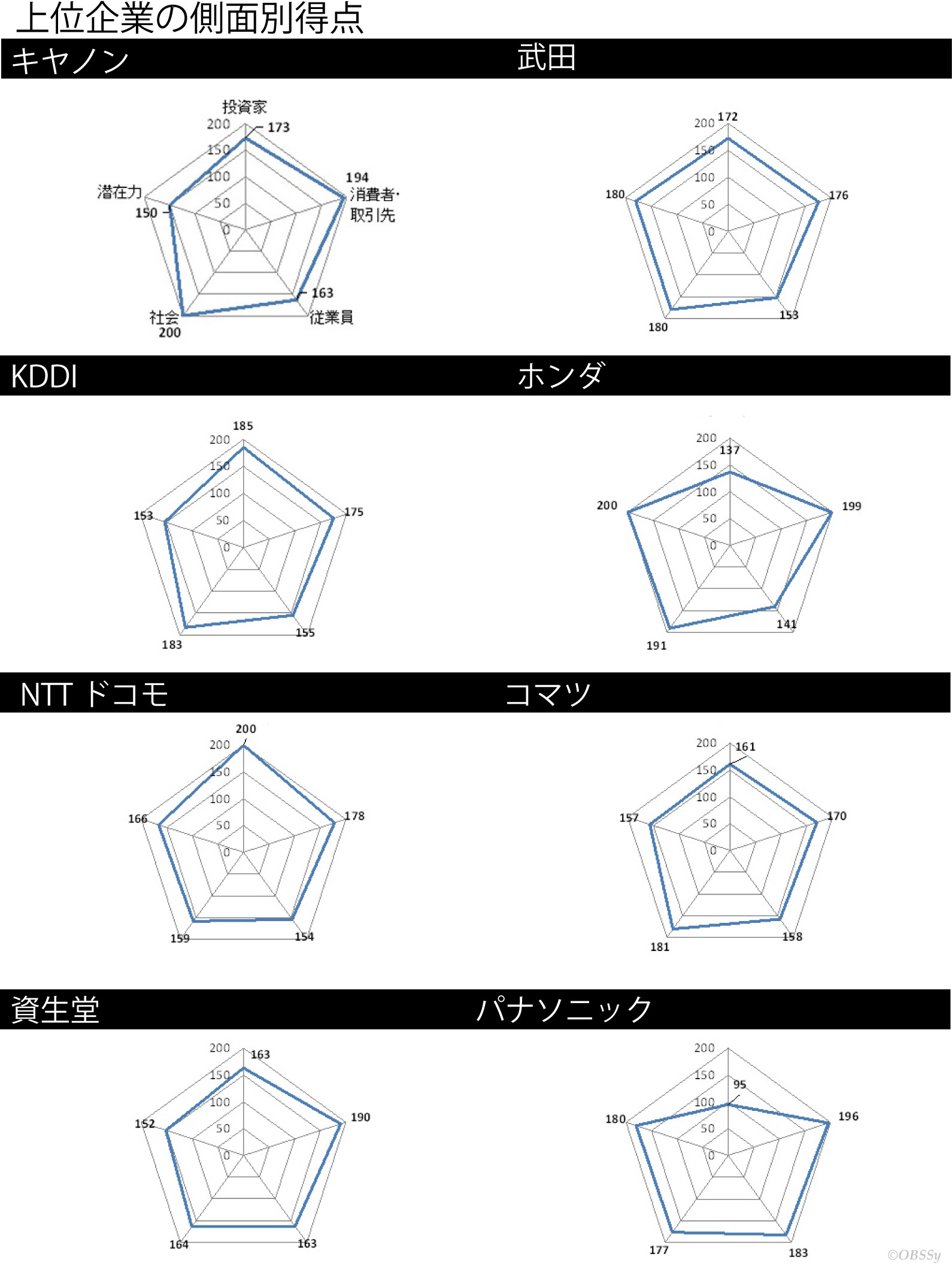On December 9, 2010, and November 29, 2013, the Nihon Keizai Shimbun published the NICES up to the 300th with each score of the five aspects, adding radar charts for the top eight. As for the top eight in 2010, Table 1 and Figure 1 show the total scores and the radar charts.