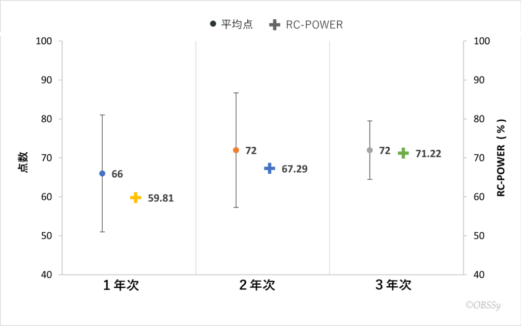 1年次から2年次での平均点の増加、標準偏差の減少は、RC-POWERでは59.81%から67.29%への増加となっていますが、どちらも標準偏差が大きいため、RC-POWERは平均点を大きく下回っています。2年次から3年次での平均点は変わらず、標準偏差は減少という変化は、RC-POWERでは67.29%から71.22%への増加となっています。標準偏差が小さくなったために、RC-POWERは2年次より大きくなっています。このように、RC-POWERは、平均点と標準偏差を一元化した値になっています。