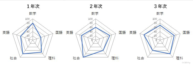 この例を各学年次の特性を一目でとらえるために、図2に得点をレーダーチャートで表示しました。すると、1年次から2年次で5角形が大きくなり総得点が増え、2年次から3年次では5角形の形が整い教科の均衡がとれたことが推察されます。レーダーチャートの形状変化を観察しても、均衡のとれた学力への推移が推察されます。